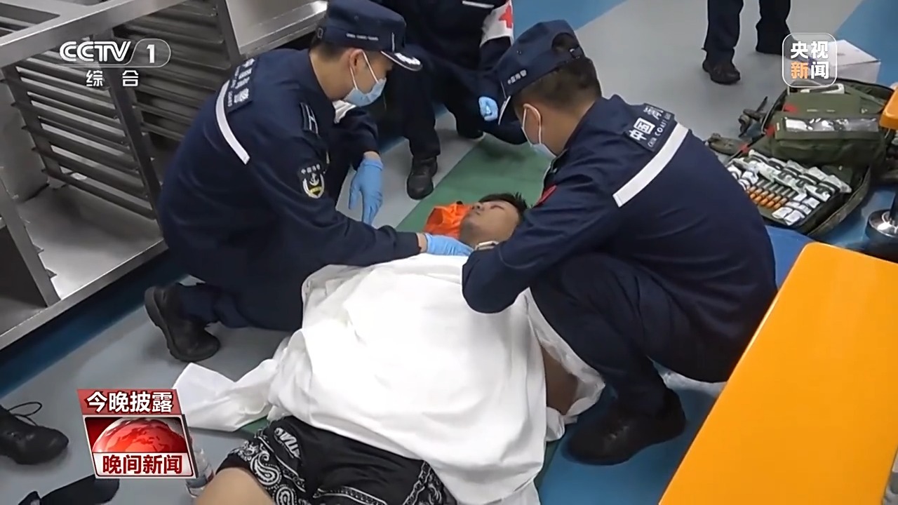 中国海警东沙舰执法员 谢彬:我们将遇险船员救上来后,大部分人都存在失温症状。我们马上对遇险船员进行紧急救治,为他们畅通气道,吸氧气,并为其补充能量液体,大概十五分钟后,遇险船员才逐渐恢复了体力。